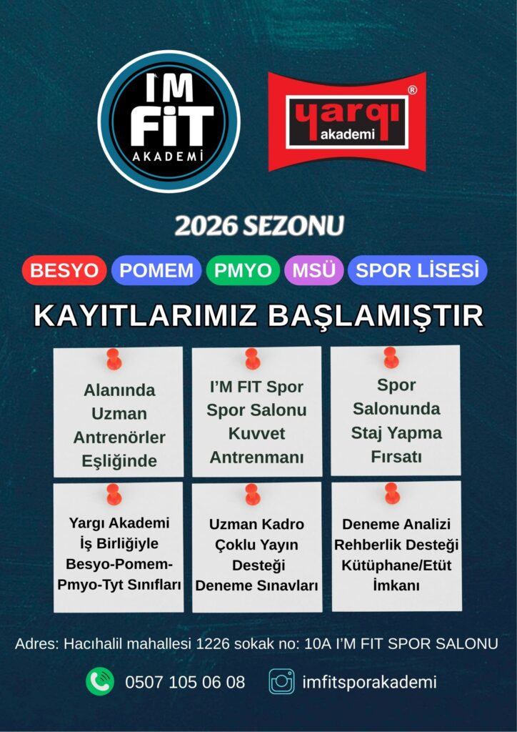 “IM Fit Spor Akademi ve Yargı Akademi iş birliğiyle, BESYO, PMYO, MSÜ ve Spor Lisesi hazırlık programları için kayıtlarımız başlamıştır! Alanında uzman ve deneyimli antrenör kadrosu eşliğinde, spor salonu kullanım hakkı, staj yapma imkanı ve bireysel rehberlik desteği gibi ayrıcalıklarla hedeflerinize ulaşmanız için özel bir eğitim deneyimi sunuyoruz. Yargı Akademi’nin uzman kadrosu ve çoklu yayın desteğiyle deneme sınavları, detaylı analizler, kütüphane ve etüt imkanlarından faydalanabilirsiniz. Hedeflerinize bir adım daha yaklaşmak ve profesyonel destek almak için bize ulaşın.